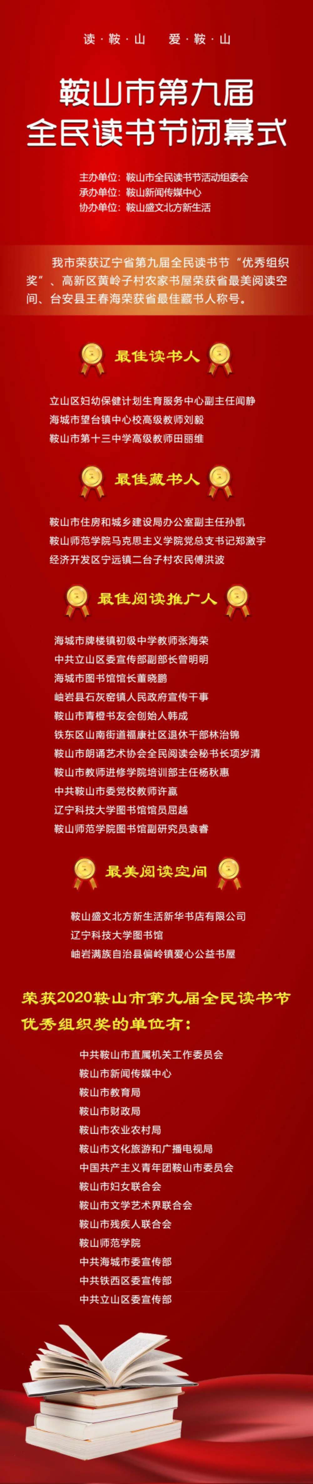 7月31日,“读鞍山、爱鞍山”鞍山市第九届全民读书节在鞍山盛文北方新生活圆满落下帷幕。本届读书节活动突出鞍山特色,面向全市党政干部、基层群众、青少年等群体,组织开展了1200余场次线上、线下的阅读推广活动。活动自4月启动之日起,我校积极组织师生参与,荣获优秀组织奖,马克思主义学院党总支书记郑激宇荣获最佳藏书人称号,图书馆副研究员袁睿荣获最佳阅读推广人称号。