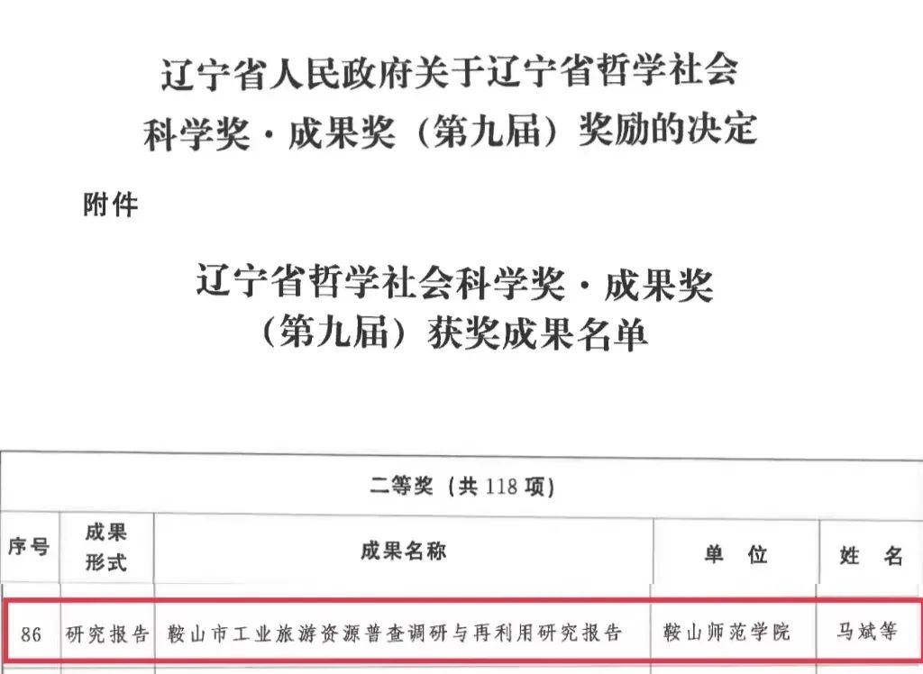 近日,辽宁省人民政府发布《辽宁省人民政府关于辽宁省哲学社会科学奖·成果奖(第九届)奖励的决定》,我校美术学院副院长(主持工作)、副教授马斌的研究报告《鞍山市工业旅游资源普查调研与再利用研究报告》获得辽宁省政府哲学社会科学奖.成果奖(第九届) 二等奖。这是我校建校以来首个以研究报告的形式获得的省级政府成果奖。